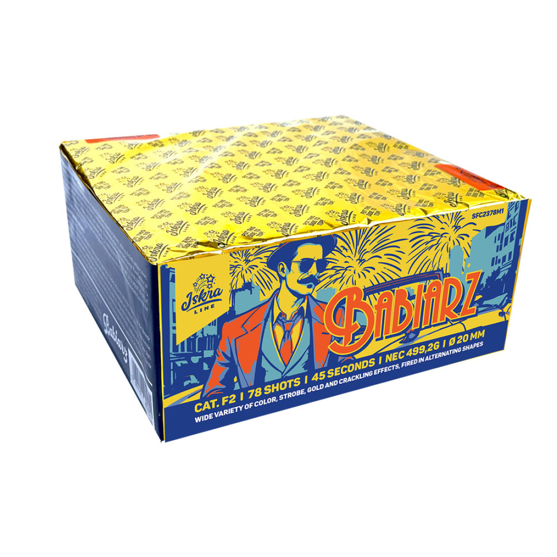 78-Schuss Feuerwerksbatterie mit einer Vielzahl von Farben, Strobe-, Gold- und Knistereffekten, abgefeuert in wechselnden Formationen